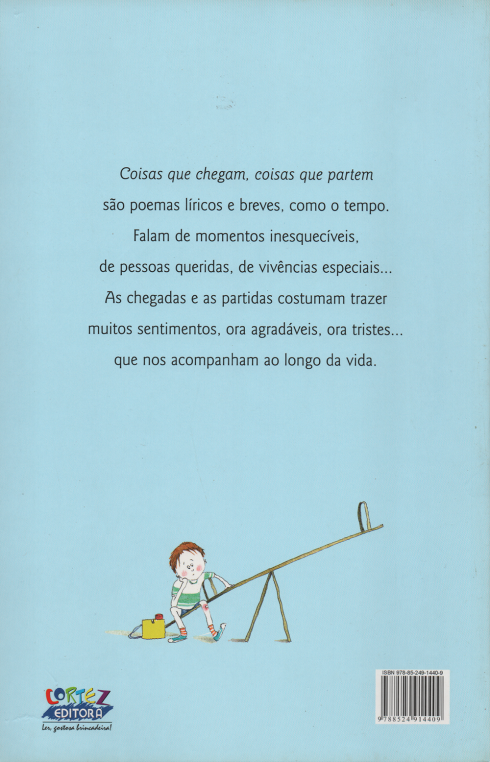 As chegadas e as partidas são tão comuns na vida das crianças, mas também podem ser momentos difíceis de se aceitar. Aqui, a autora brinca com diferentes situações, como a partida do dia, do futebol; a chegada da chuva e outras que podem ser momentos inesquecíveis. Ilustrações lúdicas de Claúdia Ramos. Esses poemas curtos se transformaram em calendário pela Taschen Editora, na Alemanha.